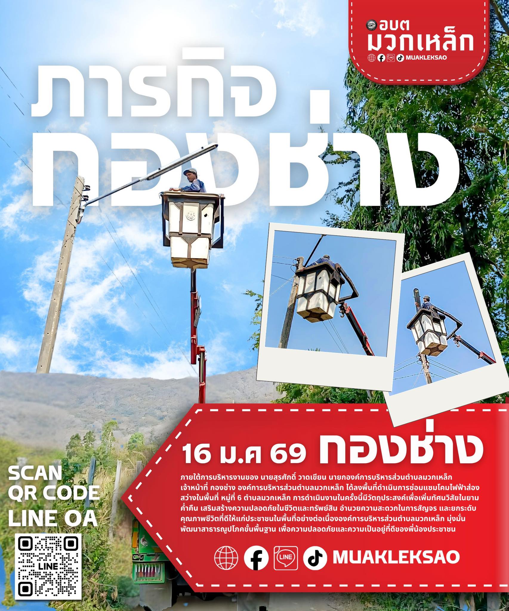 กองช่าง อบต.มวกเหล็ก ลงพื้นที่ซ่อมแซมโคมไฟฟ้าส่องส...