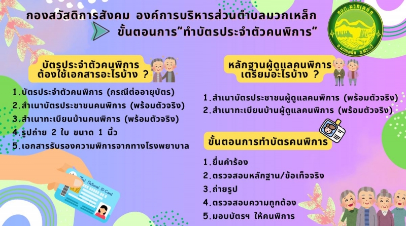 องค์การบริหารส่วนตำบลมวกเหล็ก ขอเชิญชวนพี่น้องประชาชนที่มีคุณสมบัติตามเกณฑ์ มาลงทะเบียนเพื่อรับสิทธิประโยชน์ด้านสวัสดิการอย่างทั่วถึง หากมีข้อสงสัยสามารถสอบถามเพิ่มเติมได้ที่ กองสวัสดิการสังคม อบต.มวกเหล็ก ในวันและเวลาราชการ