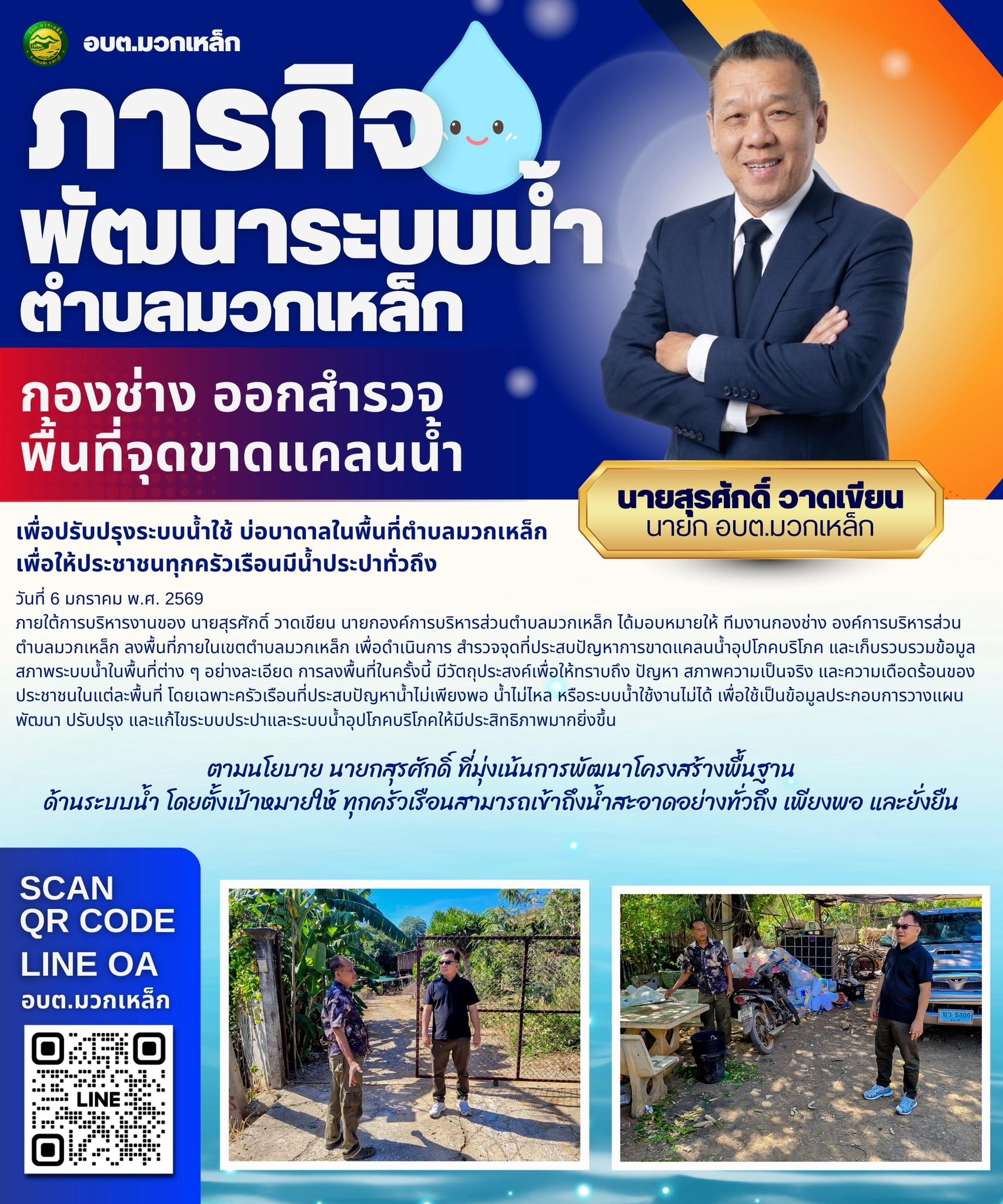 ภายใต้การบริหารงานของ นายสุรศักดิ์ วาดเขียน นายกองค์การบริหารส่วนตำบลมวกเหล็ก ได้มอบหมายให้ ทีมงานกองช่าง องค์การบริหารส่วนตำบลมวกเหล็ก ลงพื้นที่ภายในเขตตำบลมวกเหล็ก เพื่อดำเนินการ สำรวจจุดที่ประสบปัญหาการขาดแคลนน้ำอุปโภคบริโภค และเก็บรวบรวมข้อมูลสภาพระบบน้ำในพื้นที่ต่าง ๆ อย่างละเอียด