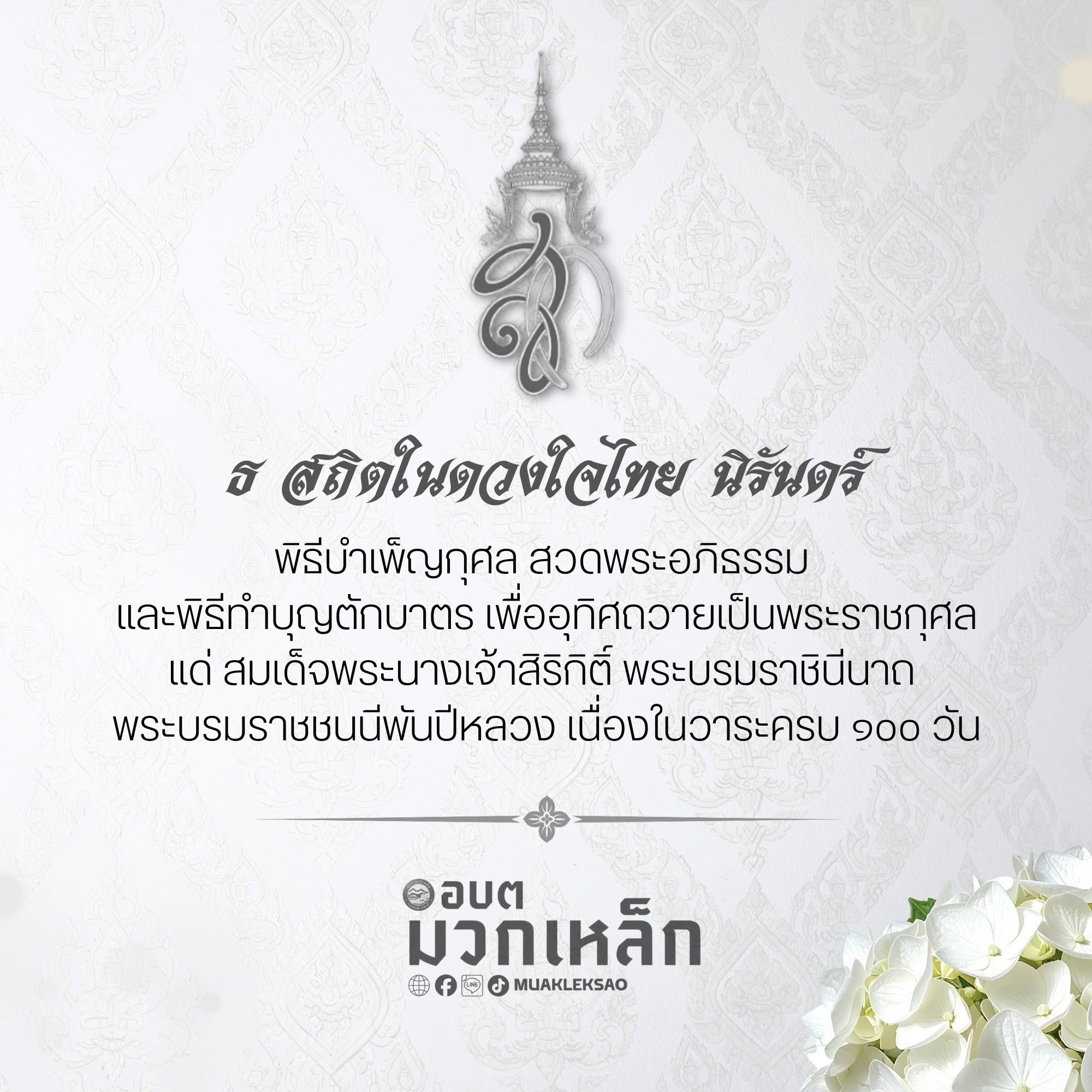 องค์การบริหารส่วนตำบลมวกเหล็ก ภายใต้การนำโดย นายสุรศักดิ์ วาดเขียน นายกองค์การบริหารส่วนตำบลมวกเหล็ก พร้อมด้วย นางสาวสุศิตา มั่นจิตร ตลอดจนคณะผู้บริหาร หัวหน้าส่วนราชการ ข้าราชการ และเจ้าหน้าที่องค์การบริหารส่วนตำบลมวกเหล็ก ได้เข้าร่วมพิธีบำเพ็ญกุศล สวดพระอภิธรรม และพิธีทำบุญตักบาตร เพื่ออุทิศถวายเป็นพระราชกุศลแด่ สมเด็จพระนางเจ้าสิริกิติ์ พระบรมราชินีนาถ พระบรมราชชนนีพันปีหลวง เนื่องในวาระครบ ๑๐๐ วัน (สตมวาร)