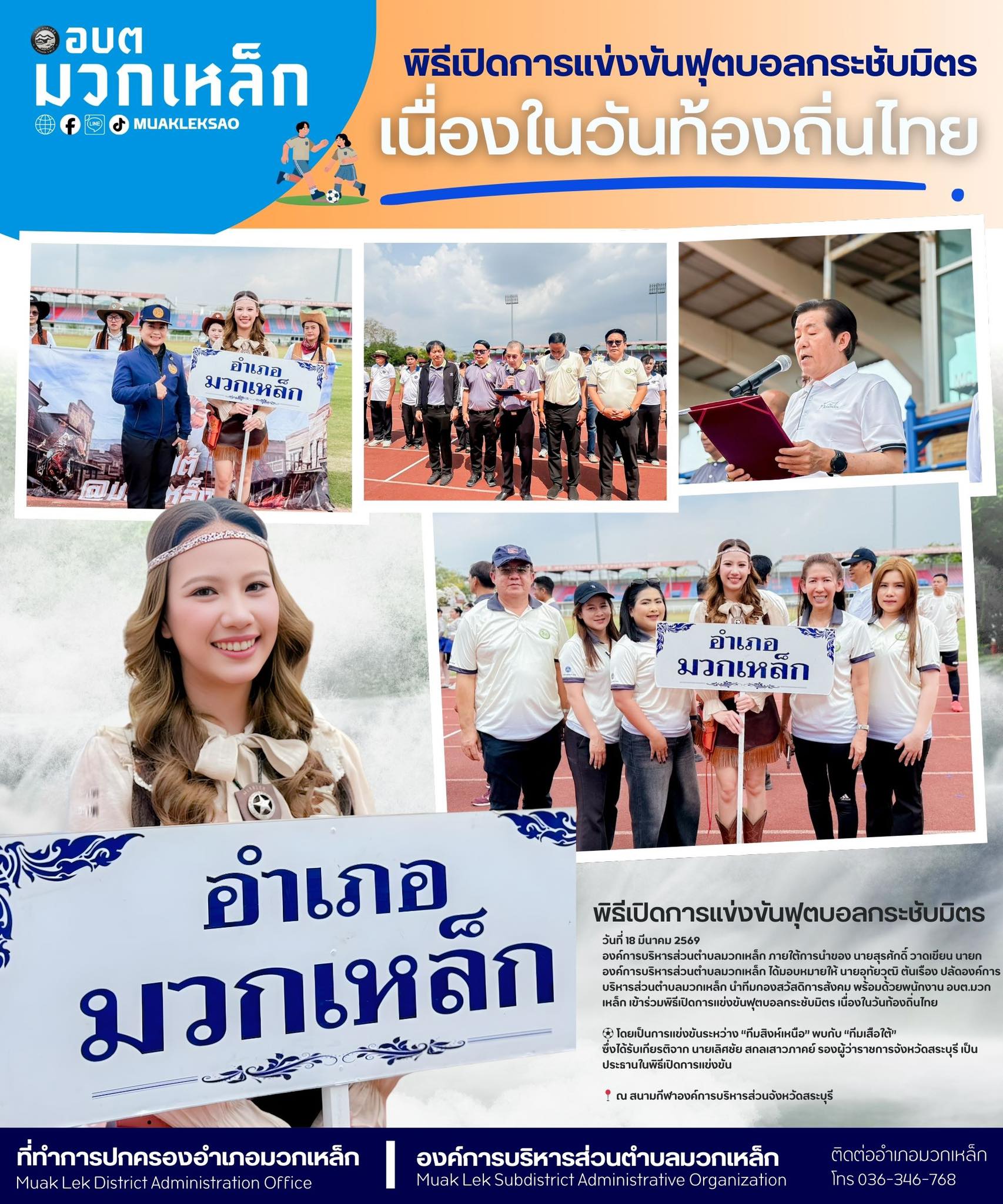 วันที่ 18 มีนาคม 2569 องค์การบริหารส่วนตำบลมวกเหล็ก ภายใต้การนำของ นายสุรศักดิ์ วาดเขียน นายกองค์การบริหารส่วนตำบลมวกเหล็ก ได้มอบหมายให้ นายอุทัยวุฒิ ตันเรือง ปลัดองค์การบริหารส่วนตำบลมวกเหล็ก นำทีมกองสวัสดิการสังคม พร้อมด้วยพนักงาน อบต.มวกเหล็ก เข้าร่วมพิธีเปิดการแข่งขันฟุตบอลกระชับมิตร เนื่องในวันท้องถิ่นไทย