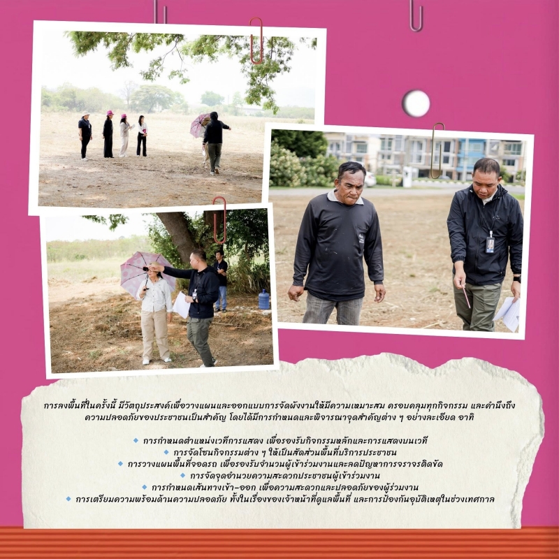 การลงพื้นที่ในครั้งนี้ มีวัตถุประสงค์เพื่อวางแผนและออกแบบการจัดผังงานให้มีความเหมาะสม ครอบคลุมทุกกิจกรรม และคำนึงถึงความปลอดภัยของประชาชนเป็นสำคัญ โดยได้มีการกำหนดและพิจารณาจุดสำคัญต่าง ๆ อย่างละเอียด อาทิ