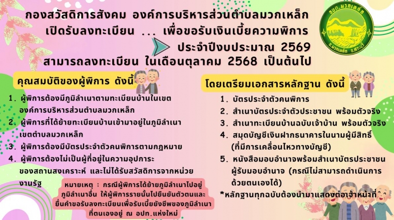 ประชาสัมพันธ์จากองค์การบริหารส่วนตำบลมวกเหล็ก กองสวัสดิการสังคม องค์การบริหารส่วนตำบลมวกเหล็ก ขอแจ้งให้ประชาชนในเขตพื้นที่ทราบว่า ขณะนี้ได้เปิดรับ การลงทะเบียนเพื่อขอรับสิทธิประโยชน์ด้านสวัสดิการสังคม ประจำปีงบประมาณ พ.ศ. 2569 ( เริ่มตั้งแต่วันที่ 1 ตุลาคม 2568 เป็นต้นไป ) โดยมีรายละเอียดดังนี้