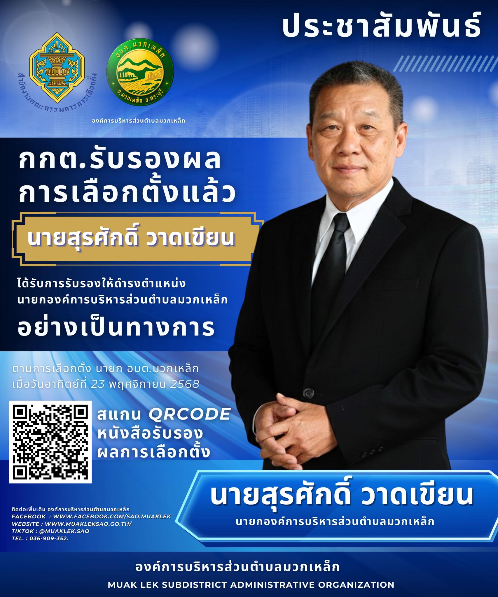 องค์การบริหารส่วนตำบลมวกเหล็ก ขอแสดงความยินดีอย่างยิ่งกับ นายสุรศักดิ์ วาดเขียน ในนามผู้นำท้องถิ่นคนใหม่ ซึ่งจะมีบทบาทสำคัญในการขับเคลื่อนการพัฒนาพื้นที่ตำบลมวกเหล็กให้ก้าวหน้า ยกระดับคุณภาพชีวิตของประชาชน และส่งเสริมการบริหารงานท้องถิ่นให้มีประสิทธิภาพ โปร่งใส และตอบสนองต่อความต้องการของชุมชนอย่างแท้จริง