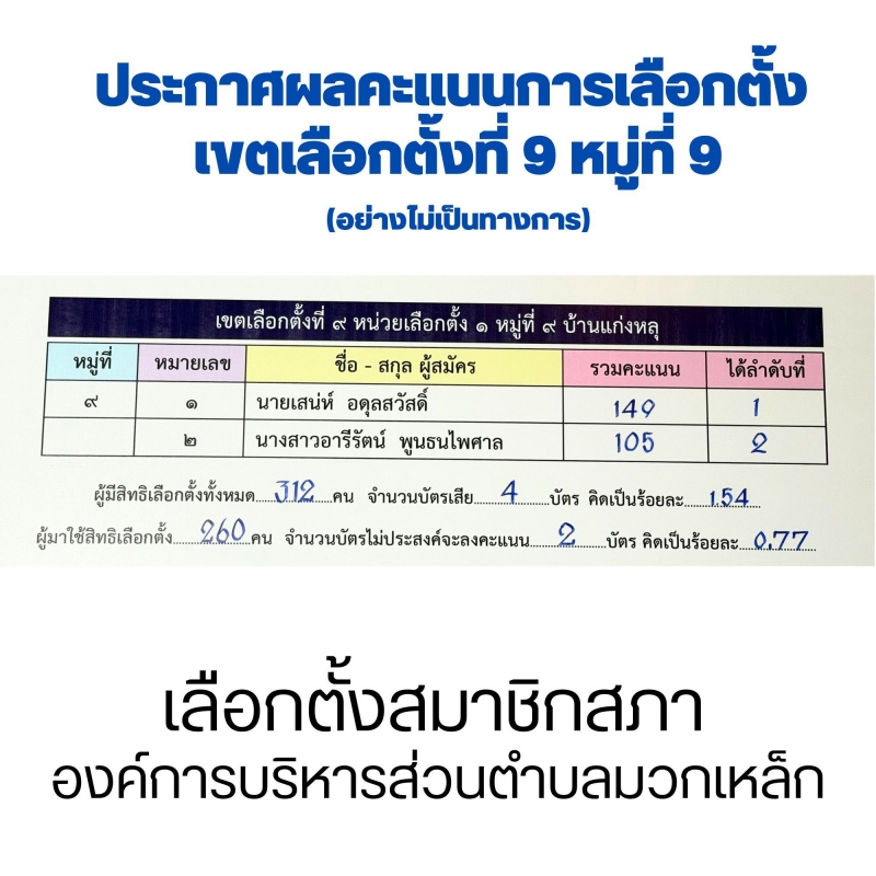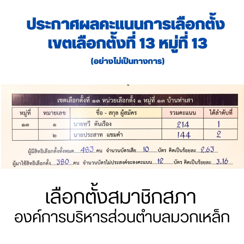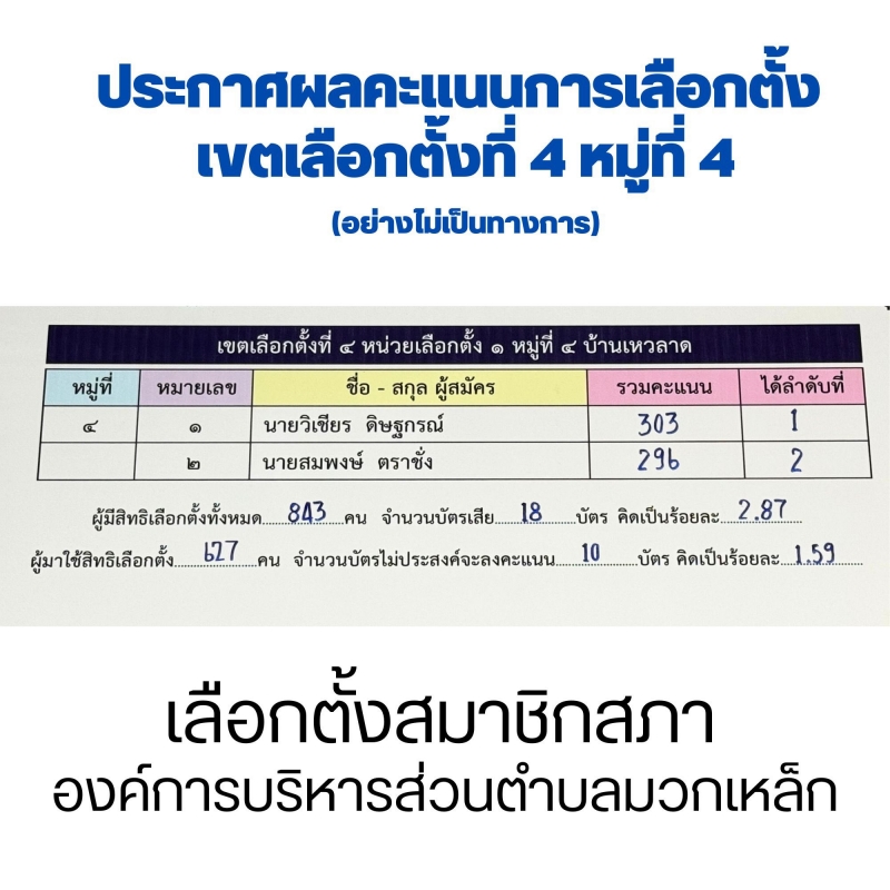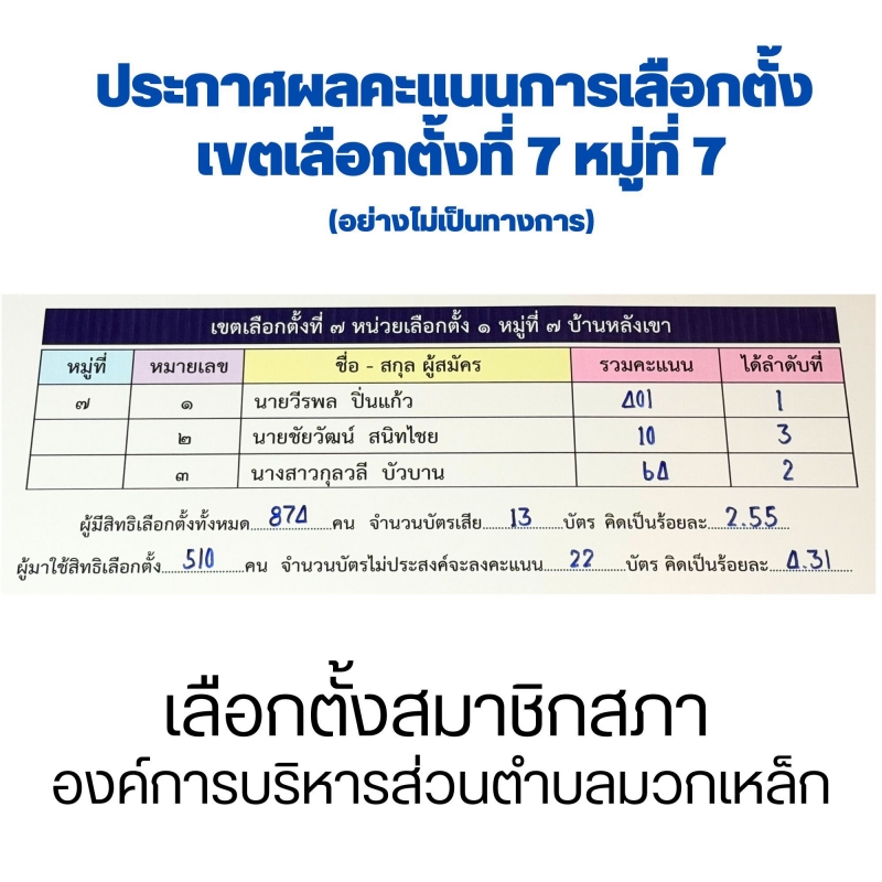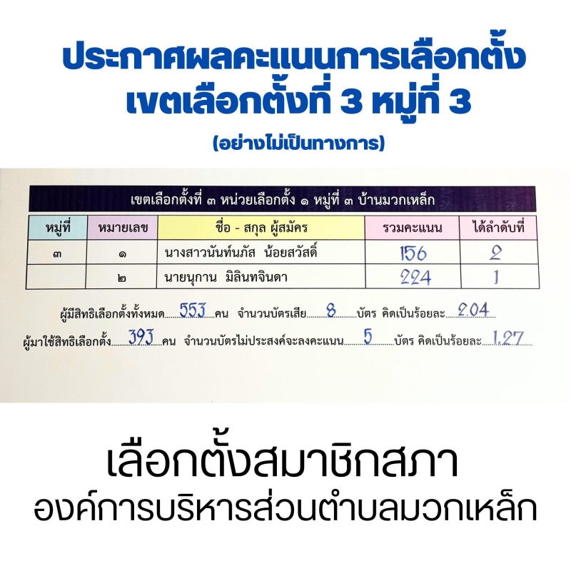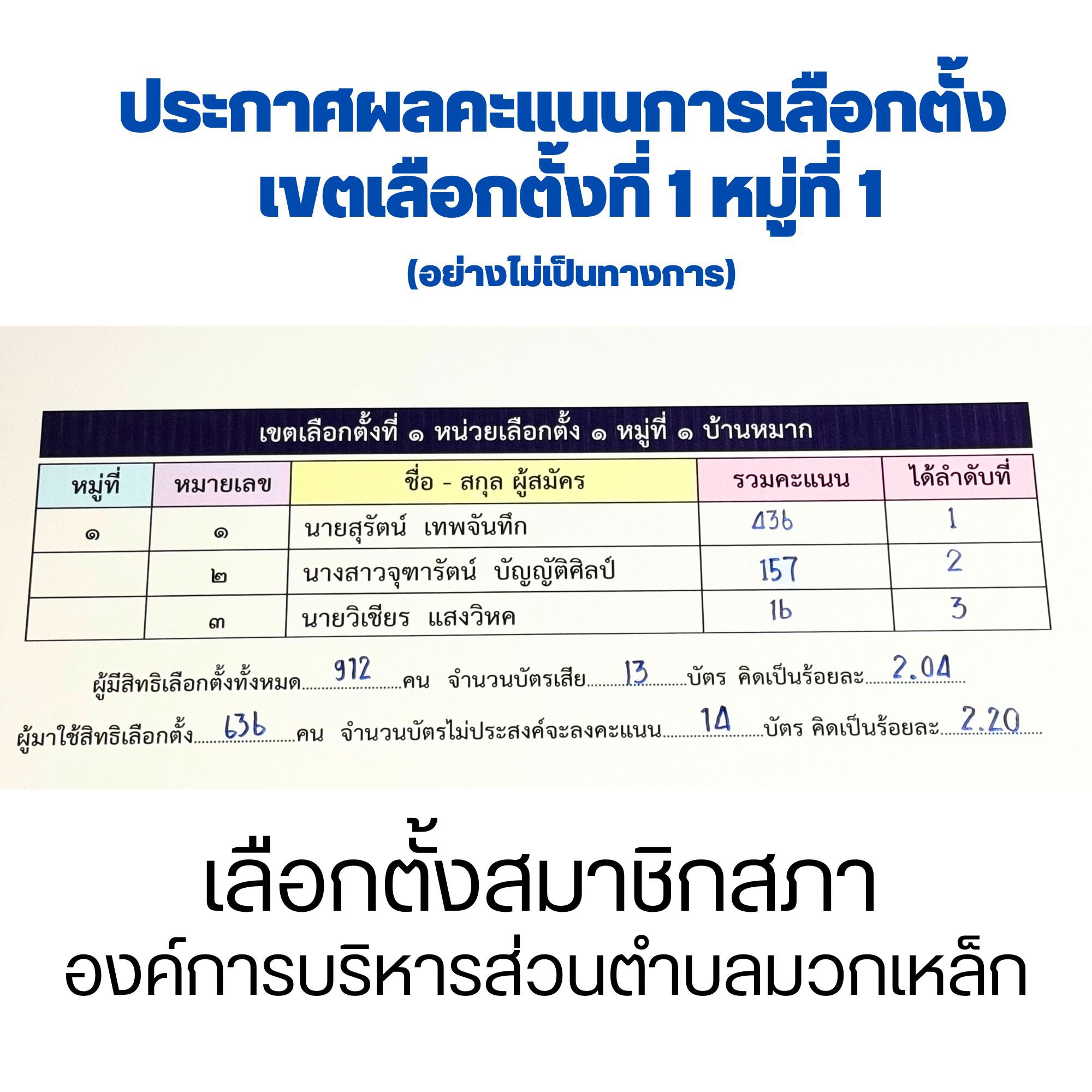 องค์การบริหารส่วนตำบลมวกเหล็ก ขอแจ้งผลการนับคะแนนเลือกตั้งสมาชิกสภาองค์การบริหารส่วนตำบลมวกเหล็ก หลังจากปิดการลงคะแนนและนับคะแนนจากทั้ง 13 เขตเลือกตั้ง ครบถ้วนแล้ว ตามผลที่แนบมานี้ นั้น