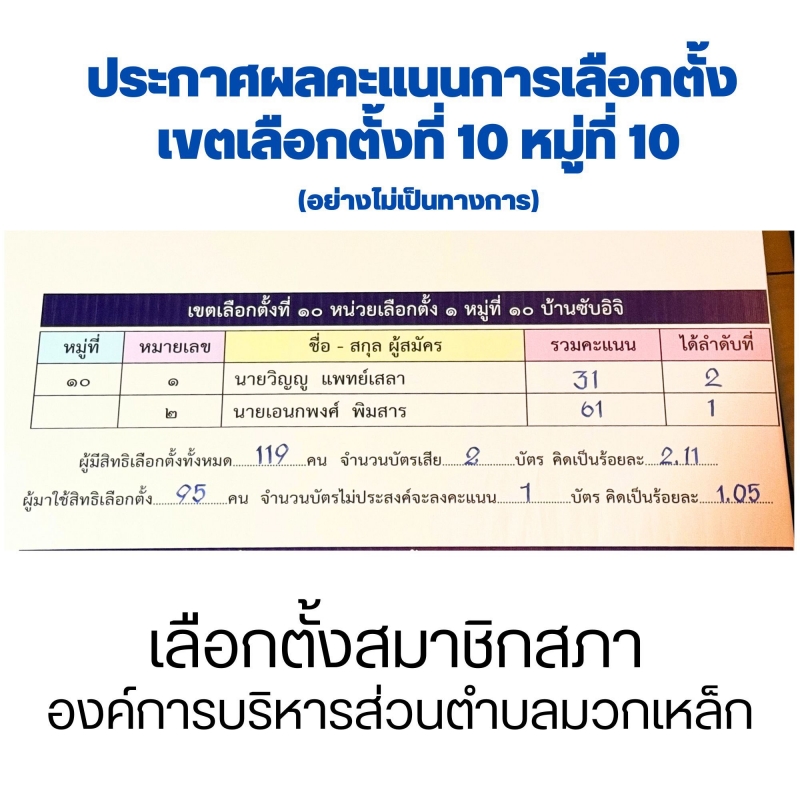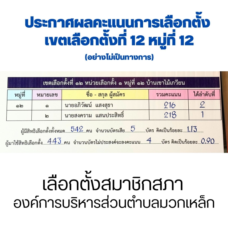 ประกาศผลการนับคะแนนเลือกตั้งสมาชิกสภาองค์การบริหารส่วนตำบลมวกเหล็ก อำเภอมวกเหล็ก จังหวัดสระบุรี