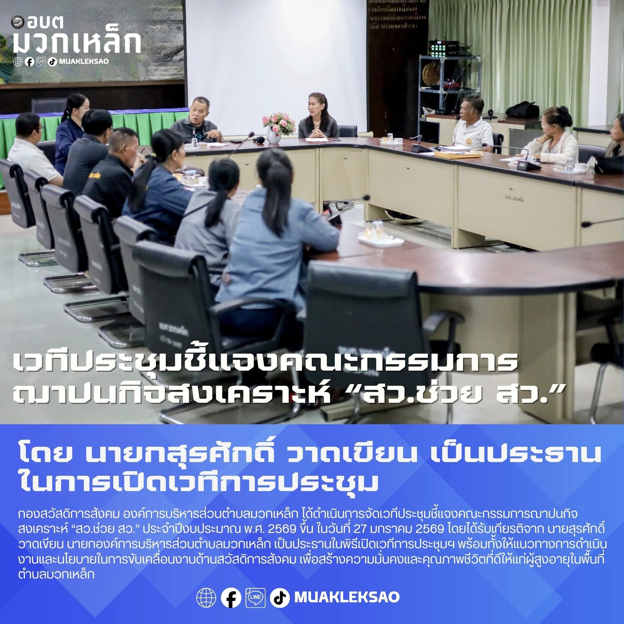 กองสวัสดิการสังคม องค์การบริหารส่วนตำบลมวกเหล็ก ได้ดำเนินการจัดเวทีประชุมชี้แจงคณะกรรมการฌาปนกิจสงเคราะห์ “สว.ช่วย สว.” ประจำปีงบประมาณ พ.ศ. 2569 ขึ้น ในวันที่ 27 มกราคม 2569 โดยได้รับเกียรติจาก นายสุรศักดิ์ วาดเขียน นายกองค์การบริหารส่วนตำบลมวกเหล็ก เป็นประธานในพิธีเปิดเวทีการประชุมฯ พร้อมทั้งให้แนวทางการดำเนินงานและนโยบายในการขับเคลื่อนงานด้านสวัสดิการสังคม เพื่อสร้างความมั่นคงและคุณภาพชีวิตที่ดีให้แก่ผู้สูงอายุในพื้นที่ตำบลมวกเหล็ก