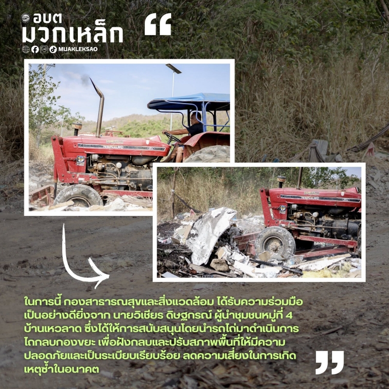 ในการนี้ กองสาธารณสุขและสิ่งแวดล้อม ได้รับความร่วมมือเป็นอย่างดียิ่งจาก นายวิเชียร ดิษฐกรณ์ ผู้นำชุมชนหมู่ที่ 4 บ้านเหวลาด ซึ่งได้ให้การสนับสนุนโดยนำรถไถ่มาดำเนินการไถกลบกองขยะ เพื่อฝังกลบและปรับสภาพพื้นที่ให้มีความปลอดภัยและเป็นระเบียบเรียบร้อย ลดความเสี่ยงในการเกิดเหตุซ้ำในอนาคต