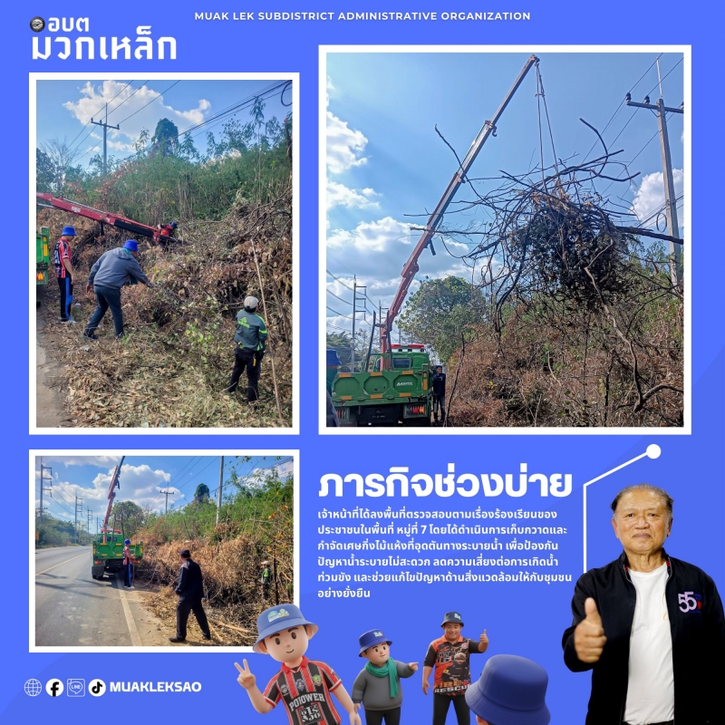 เจ้าหน้าที่ได้ลงพื้นที่ตรวจสอบตามเรื่องร้องเรียนของประชาชนในพื้นที่ หมู่ที่ 7 โดยได้ดำเนินการเก็บกวาดและกำจัดเศษกิ่งไม้แห้งที่อุดตันทางระบายน้ำ เพื่อป้องกันปัญหาน้ำระบายไม่สะดวก ลดความเสี่ยงต่อการเกิดน้ำท่วมขัง และช่วยแก้ไขปัญหาด้านสิ่งแวดล้อมให้กับชุมชนอย่างยั่งยืน