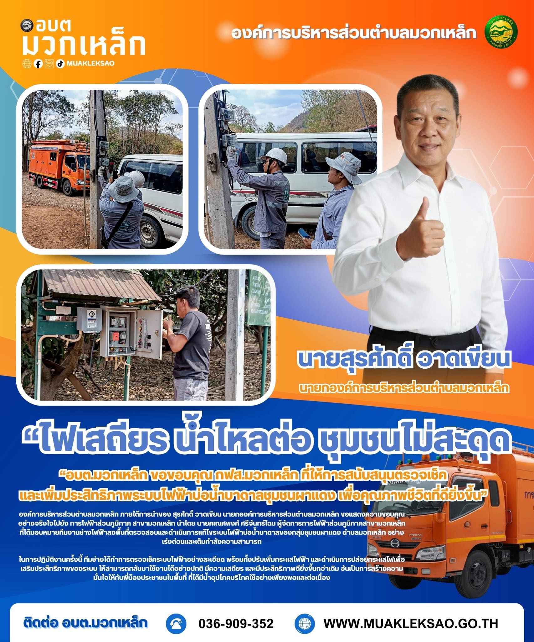 องค์การบริหารส่วนตำบลมวกเหล็ก ขอขอบคุณผู้บริหารและทีมงานช่างไฟฟ้าทุกท่าน ที่ให้ความร่วมมือ สนับสนุน และประสานการทำงานร่วมกันเป็นอย่างดียิ่ง สะท้อนถึงความมุ่งมั่นในการบูรณาการความร่วมมือระหว่างหน่วยงาน เพื่อยกระดับคุณภาพชีวิตของประชาชนในตำบลมวกเหล็กให้มีความเป็นอยู่ที่ดี มั่นคง และยั่งยืน