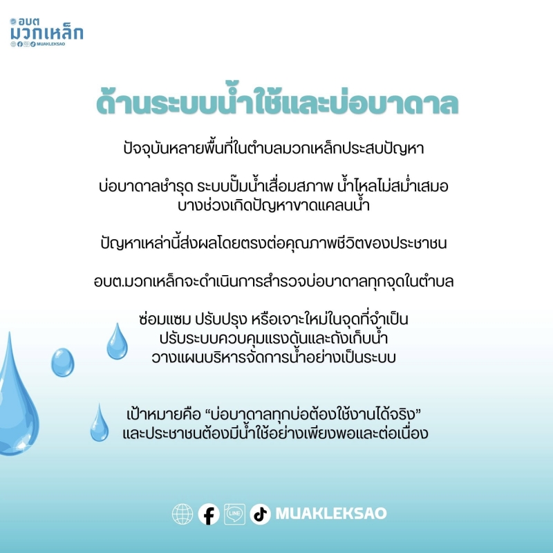 อบต.มวกเหล็ก จะดำเนินการจัดตั้ง “จุดบริการน้ำดื่มสะอาดระบบ RO ทุกหมู่บ้าน” เพื่อให้ประชาชนสามารถเข้าถึงน้ำที่ได้มาตรฐาน ปลอดภัย ลดภาระค่าใช้จ่ายในครัวเรือน และยกระดับสุขอนามัยของชุมชน