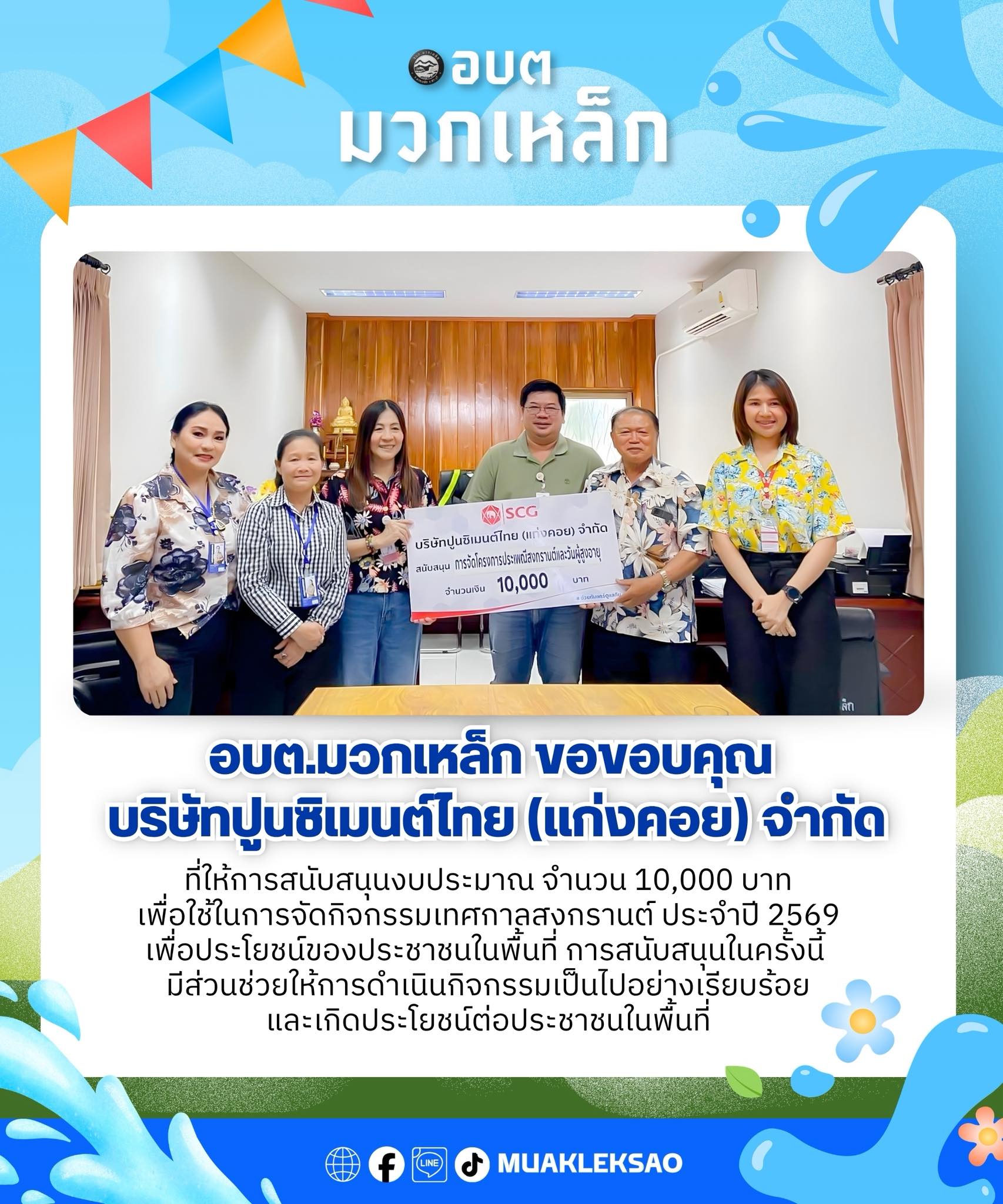 องค์การบริหารส่วนตำบลมวกเหล็ก ขอขอบคุณ บริษัทปูนซิเมนต์ (แก่งคอย) จำกัดที่ให้การสนับสนุนงบประมาณ จำนวน 10,000 บาท เพื่อใช้ในการจัดกิจกรรมเทศกาลสงกรานต์ ประจำปี 2569