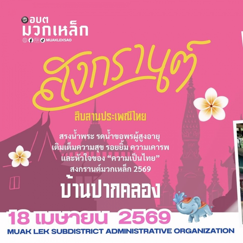 วันที่ 18 เมษายน 2569 องค์การบริหารส่วนตำบลมวกเหล็ก ภายใต้การนำของ นายสุรศักดิ์ วาดเขียน นายกองค์การบริหารส่วนตำบลมวกเหล็กได้มอบหมายให้ นางสาวสุศิตา มั่นจิตร รองนายกองค์การบริหารส่วนตำบลมวกเหล็ก พร้อมด้วย นางสาวปฏิมา สังฆะมณี เลขานุการนายกองค์การบริหารส่วนตำบลมวกเหล็กเป็นผู้แทนเข้าร่วมกิจกรรมอันเป็นมงคล เนื่องในช่วงเทศกาลสงกรานต์ ซึ่งถือเป็นวันขึ้นปีใหม่ไทย