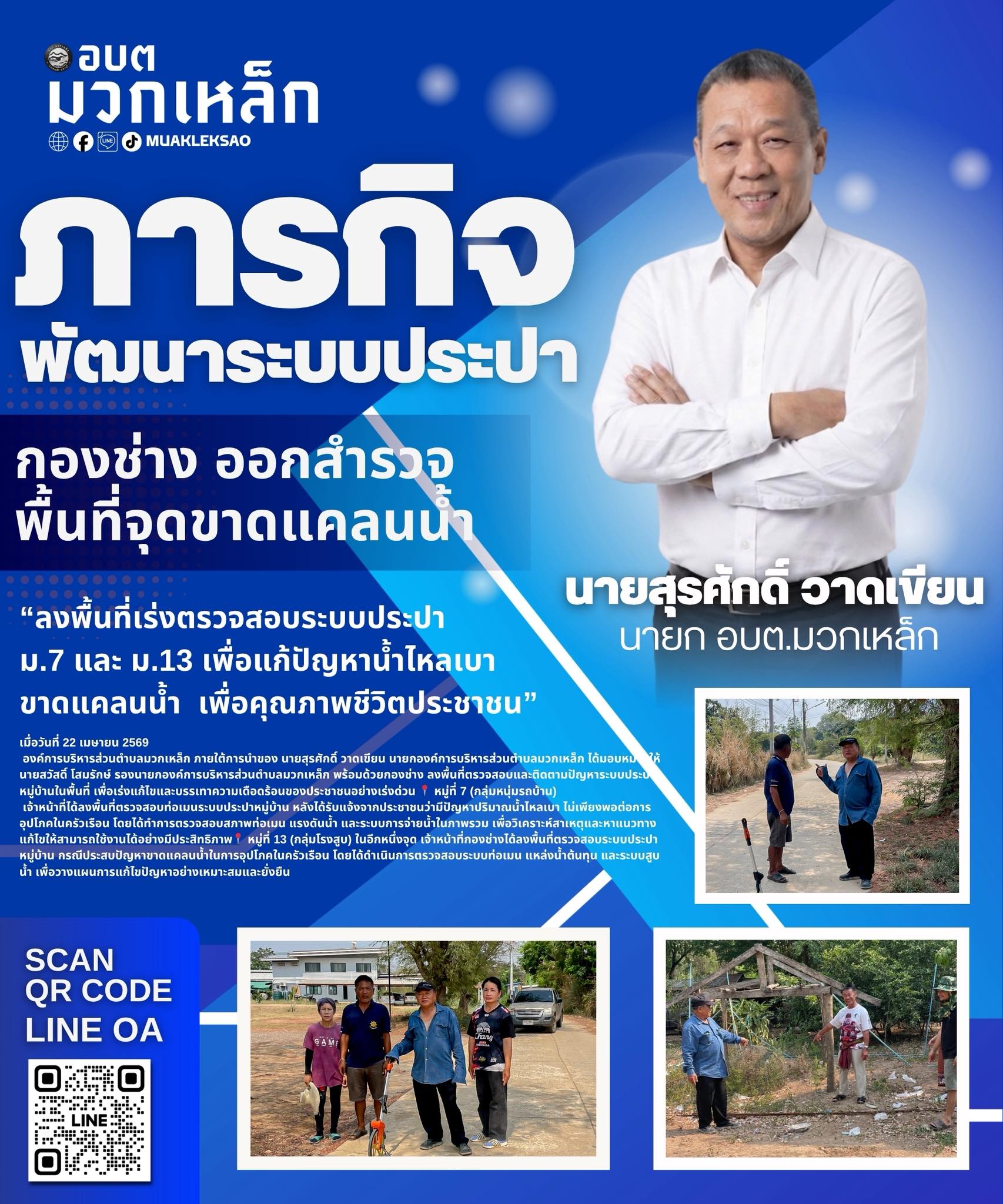 องค์การบริหารส่วนตำบลมวกเหล็ก ภายใต้การนำของ นายสุรศักดิ์ วาดเขียน นายกองค์การบริหารส่วนตำบลมวกเหล็ก ได้มอบหมายให้ นายสวัสดิ์ โสมรักษ์ รองนายกองค์การบริหารส่วนตำบลมวกเหล็ก พร้อมด้วยกองช่าง ลงพื้นที่ตรวจสอบและติดตามปัญหาระบบประปาหมู่บ้านในพื้นที่ เพื่อเร่งแก้ไขและบรรเทาความเดือดร้อนของประชาชนอย่างเร่งด่วน