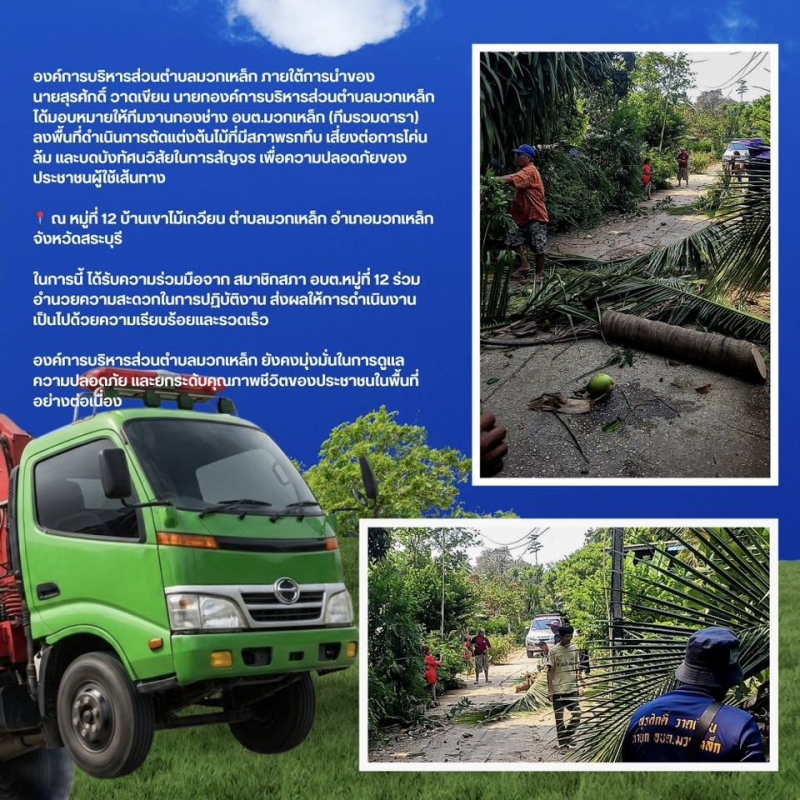 วันที่ 22 เมษายน 2569 องค์การบริหารส่วนตำบลมวกเหล็ก ภายใต้การนำของ นายสุรศักดิ์ วาดเขียน นายกองค์การบริหารส่วนตำบลมวกเหล็ก ได้มอบหมายให้ทีมงานกองช่าง อบต.มวกเหล็ก (ทีมรวมดารา) ลงพื้นที่ดำเนินการตัดแต่งต้นไม้ที่มีสภาพรกทึบ เสี่ยงต่อการโค่นล้ม และบดบังทัศนวิสัยในการสัญจร เพื่อความปลอดภัยของประชาชนผู้ใช้เส้นทาง