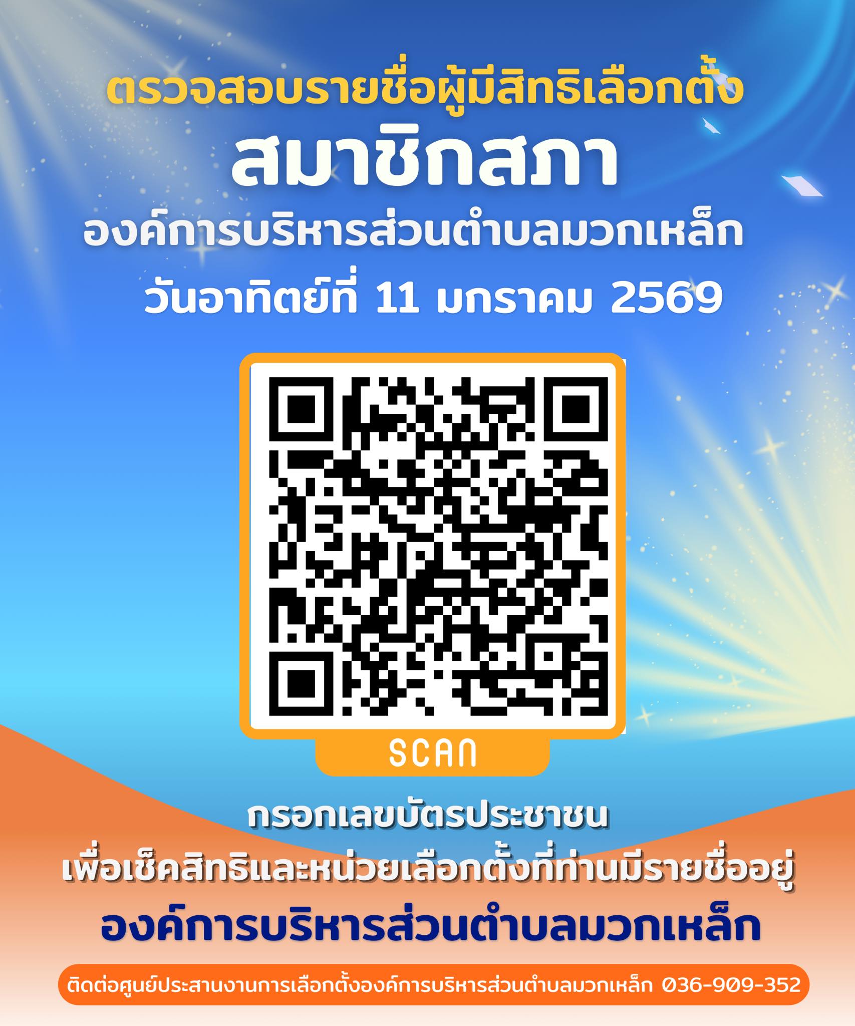 ประชาสัมพันธ์  ขอเชิญประชาชนตรวจสอบรายชื่อผู้มีสิทธิเลือกตั้ง สมาชิกสภาองค์การบริหารส่วนตำบลมวกเหล็ก เพียงสแกน QR Code ที่กำหนด แล้วกรอกหมายเลขบัตรประจำตัวประชาชนของท่าน เพื่อทำการตรวจสอบสิทธิการเลือกตั้ง และทราบหน่วยเลือกตั้งที่ท่านมีรายชื่ออยู่