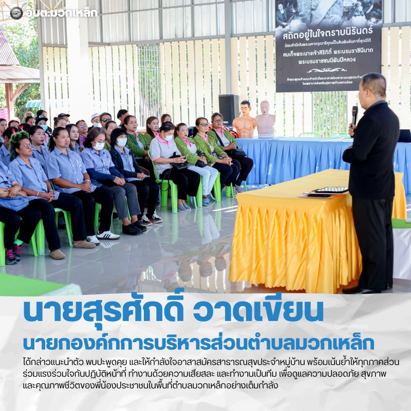 โอกาสนี้ นายสุรศักดิ์ วาดเขียน นายกองค์การบริหารส่วนตำบลมวกเหล็ก ได้กล่าวแนะนำตัว พบปะพูดคุย และให้กำลังใจอาสาสมัครสาธารณสุขประจำหมู่บ้าน พร้อมเน้นย้ำให้ทุกภาคส่วนร่วมแรงร่วมใจกันปฏิบัติหน้าที่ ทำงานด้วยความเสียสละ และทำงานเป็นทีม เพื่อดูแลความปลอดภัย สุขภาพ และคุณภาพชีวิตของพี่น้องประชาชนในพื้นที่ตำบลมวกเหล็กอย่างเต็มกำลัง