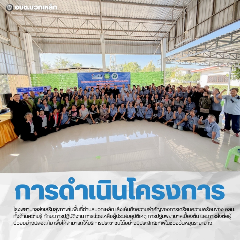 โรงพยาบาลส่งเสริมสุขภาพในพื้นที่ตำบลมวกเหล็ก เล็งเห็นถึงความสำคัญของการเตรียมความพร้อมของ อสม. ทั้งด้านความรู้ ทักษะการปฏิบัติงาน การช่วยเหลือผู้ประสบอุบัติเหตุ การปฐมพยาบาลเบื้องต้น และการส่งต่อผู้ป่วยอย่างปลอดภัย เพื่อให้สามารถให้บริการประชาชนได้อย่างมีประสิทธิภาพในช่วงวันหยุดระยะยาว