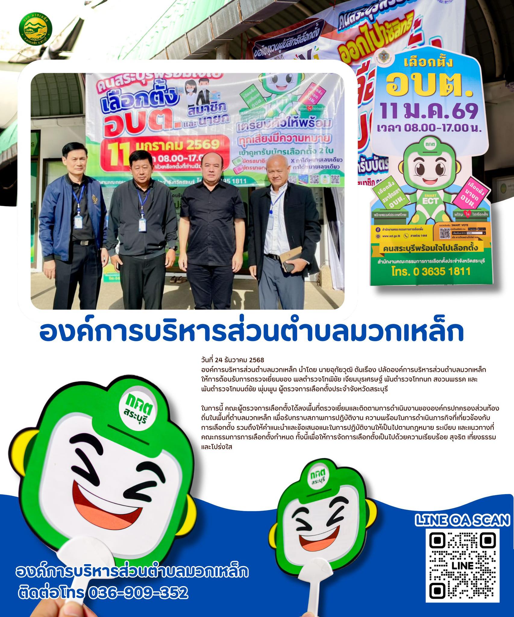 ในการนี้ คณะผู้ตรวจการเลือกตั้งได้ลงพื้นที่ตรวจเยี่ยมและติดตามการดำเนินงานขององค์กรปกครองส่วนท้องถิ่นในพื้นที่ตำบลมวกเหล็ก เพื่อรับทราบสภาพการปฏิบัติงาน ความพร้อมในการดำเนินภารกิจที่เกี่ยวข้องกับการเลือกตั้ง รวมถึงให้คำแนะนำและข้อเสนอแนะในการปฏิบัติงานให้เป็นไปตามกฎหมาย ระเบียบ และแนวทางที่คณะกรรมการการเลือกตั้งกำหนด ทั้งนี้เพื่อให้การจัดการเลือกตั้งเป็นไปด้วยความเรียบร้อย สุจริต เที่ยงธรรม และโปร่งใส