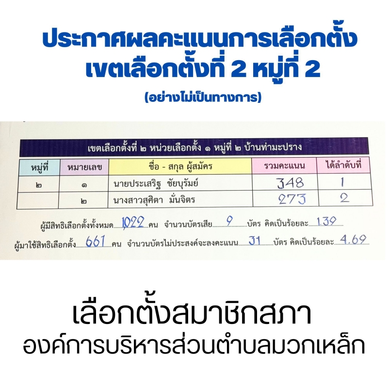 ประกาศผลการนับคะแนนเลือกตั้งสมาชิกสภาองค์การบริหารส่วนตำบลมวกเหล็ก อำเภอมวกเหล็ก จังหวัดสระบุรี