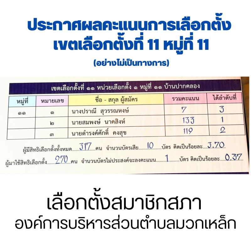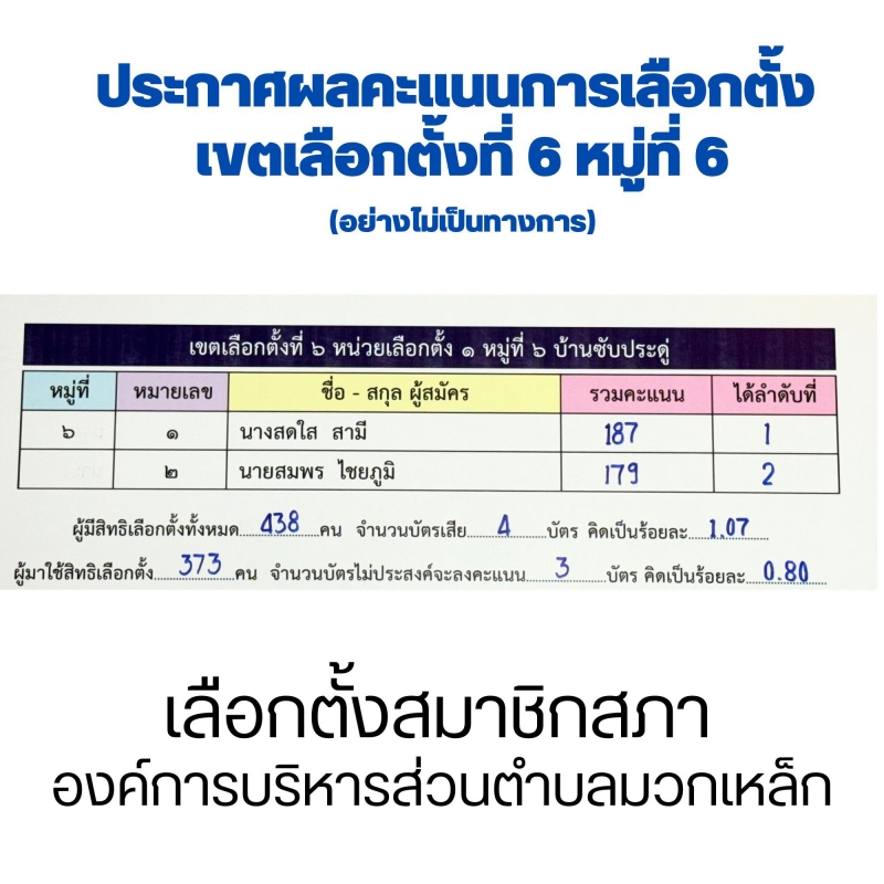 องค์การบริหารส่วนตำบลมวกเหล็ก ขอแจ้งผลการนับคะแนนเลือกตั้งสมาชิกสภาองค์การบริหารส่วนตำบลมวกเหล็ก หลังจากปิดการลงคะแนนและนับคะแนนจากทั้ง 13 เขตเลือกตั้ง ครบถ้วนแล้ว ตามผลที่แนบมานี้ นั้น