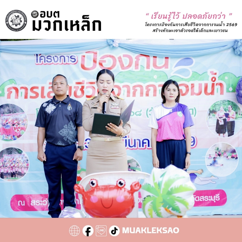 องค์การบริหารส่วนตำบลมวกเหล็ก ภายใต้การนำของ นายสุรศักดิ์ วาดเขียน นายกองค์การบริหารส่วนตำบลมวกเหล็ก ได้มอบหมายให้ นางสาวสุศิตา มั่นจิตร รองนายกองค์การบริหารส่วนตำบลมวกเหล็ก เข้าร่วมเป็นประธานในพิธีเปิด “โครงการป้องกันการเสียชีวิตจากการจมน้ำ ประจำปี 2569”