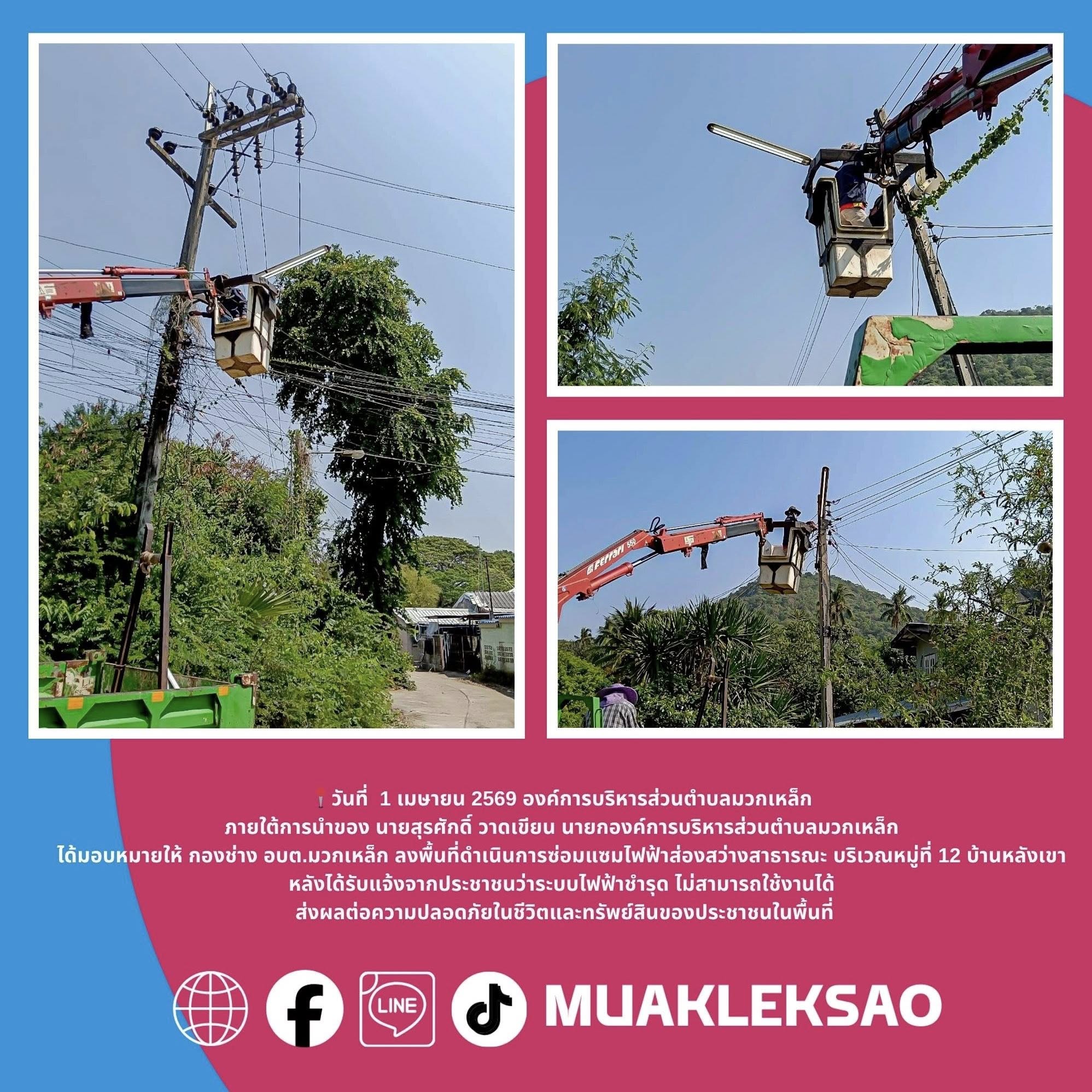 องค์การบริหารส่วนตำบลมวกเหล็ก ลงพื้นที่ดำเนินการซ่อมแซมไฟฟ้าส่องสว่างสาธารณะ บริเวณหมู่ที่ 12 บ้านหลังเขา หลังได้รับแจ้งจากประชาชนว่าระบบไฟฟ้าชำรุด ไม่สามารถใช้งานได้